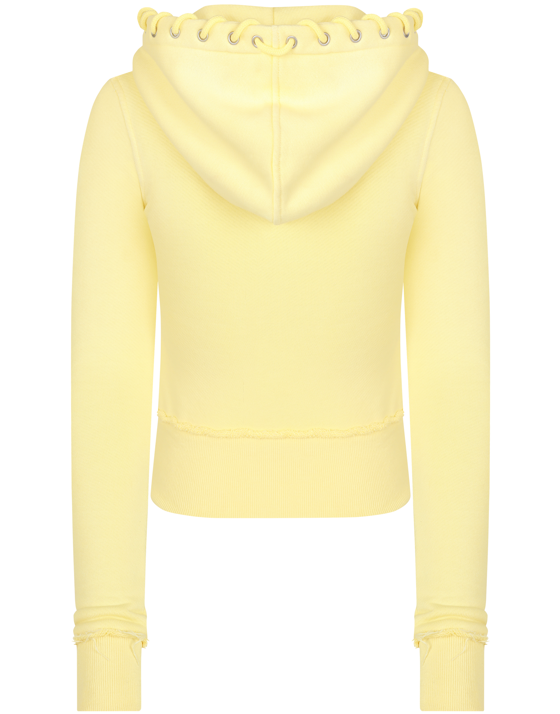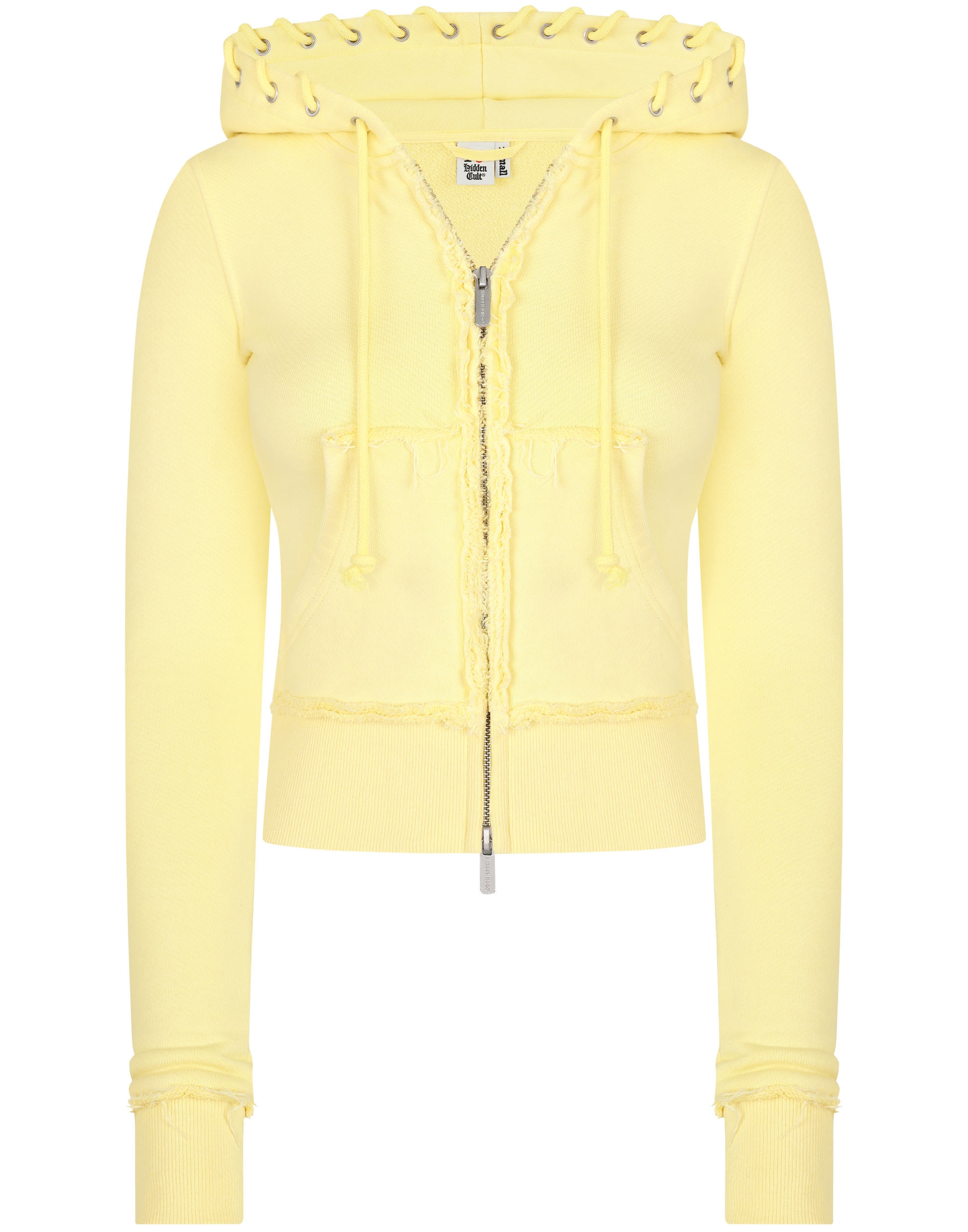 Made from our premium terry 100% cotton in a custom. Each piece is carefully crafted by our team and professionally dyed and pre-shrunk using our custom organic dye and wash process. This fitted zip hoodie features a sculpted silhouette with hand-distressed accents, removable lacing through the hood, and signature brushed matte silver hardware with an engraved logo puller.